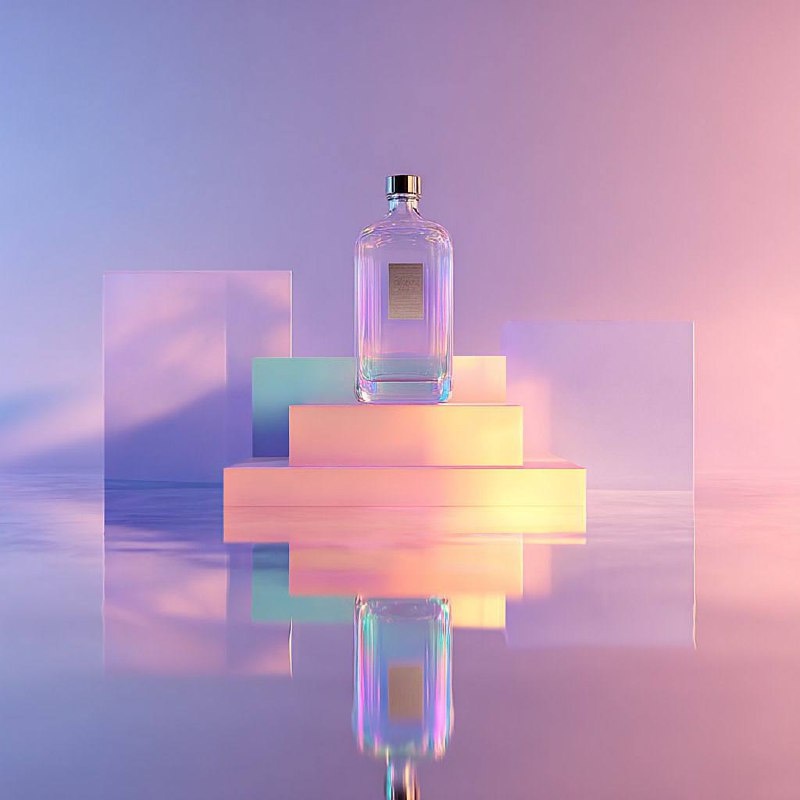 Представьте: ваш товар на "иридисцентном кристальном подиуме", окружённом мягкими пастельными оттенками и нежным фиолетовым фоном. Всё это выполнено в минималистичном стиле, с мечтательной атмосферой и мягким освещением. 💎✨