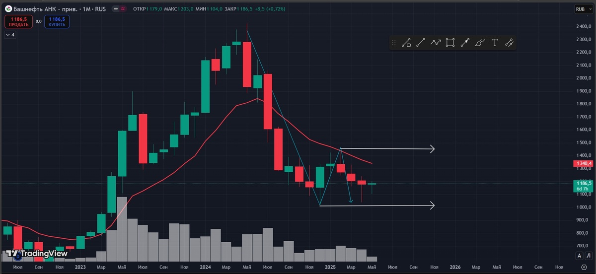 В этой акции всё довольно просто как по технике, так и по фигуре. Бирюзовой тонкой траекторией указал движение цены, направление в которой сейчас идет вниз. Мы пока не пробили ни один из указанных экстремумов, поэтому торговля на пробой сейчас в ожидании. Торгуемся сейчас внутренней свечкой, которая никакой информации нам не несет, а потому торговать такую формацию не стоит. И по скользящей у нас идет движение вниз, она выступает как уровень сопротивления. Как итог, никаких лонговых ситуаций я не вижу. Объемы маленькие и результата нет. Как уже говорил, ликвидность и короткие офз могут помочь в вопросе использования денег. Не является индивидуальной инвестиционной рекомендацией. #рубрикамесяц Обязательно к просмотру прошлый пост по ссылке - https://t.me/c/1324735280/7840.