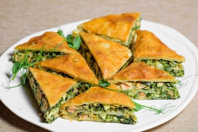 Пирог с рыбой и шпинатом Ингредиенты: 500 г слоеного теста, 500 г филе лосося или форели, 500 г шпината, 3 ст.л. сливочного масла, 3 ст.л. сливок, 2 зубчика чеснока, 2 яйца, соль, перец. Приготовление. Промойте шпинат, удалите толстые стебли, крупно нарежьте, на 1-2 минуты опустите в кипящую воду, затем отбросьте на дуршлаг. В сковороде нагрейте немного растительного масла, добавьте туда шпинат, подождите, пока испарится влага. После этого добавьте в шпинат сливочное масло, слегка посолите и обжаривайте 2-3 минуты. Пока шпинат остывает, очистите рыбное филе от мелких косточек и нарежьте небольшими кубиками. Смешайте шпинат и рыбу, добавьте пропущенный через пресс чеснок, сливки и яйца. Раскатайте тесто и распределите большую его часть по форме для запекания, внутрь выложите начинку, сверху накройте оставшимся тестом. Сделайте несколько небольших отверстий в верхней части теста, чтобы выходил пар, смажьте пирог яичным желтком. Пирог готовится в духовке 30-40 минут при температуре 200°
