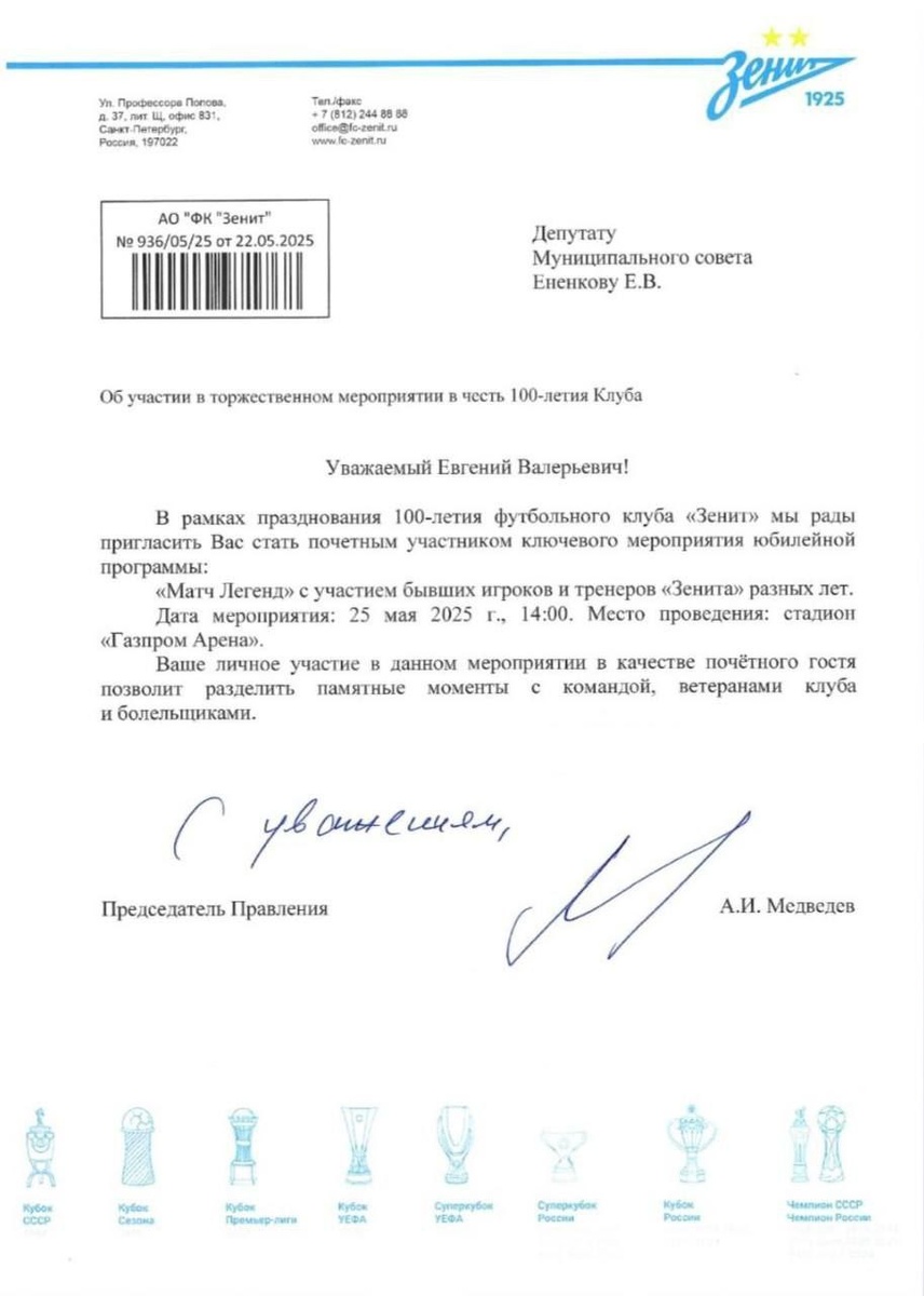 100 лет ФК Зенит! Сегодня я с огромным удовольствием присоединюсь к празднованию столетия нашего любимого футбольного клуба "Зенит", по приглашению председателя правления клуба, Александра Ивановича Медведева. В программе — захватывающий Матч легенд с участием бывших игроков и тренеров, которые сделали историю нашего клуба. Я горжусь тем, что являюсь частью этой великой семьи, ведь не один год провел, обучаясь футболу в ДСИ Зенит. Это обещает быть незабываемым событием на Газпром Арене! Кто еще собирается посетить это событие? Давайте создадим атмосферу настоящего футбольного праздника! Люби Зенит больше побед! #ЕНЕНКОВ #Зенит100 #Зенит #Газпром