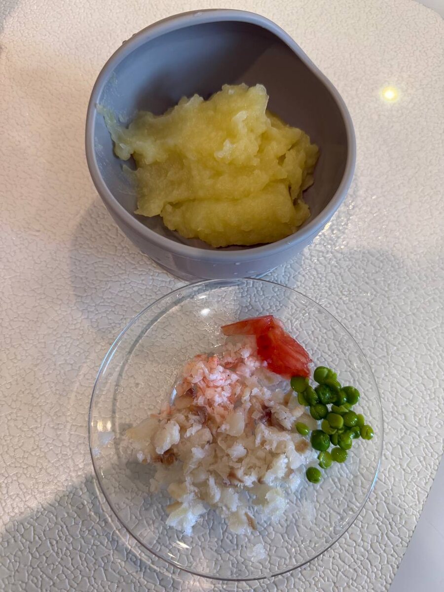 Картофельное пюре🥔, рыбка🐟,креветка🦐 , помидорчик🍅, зеленый горошек 🫛