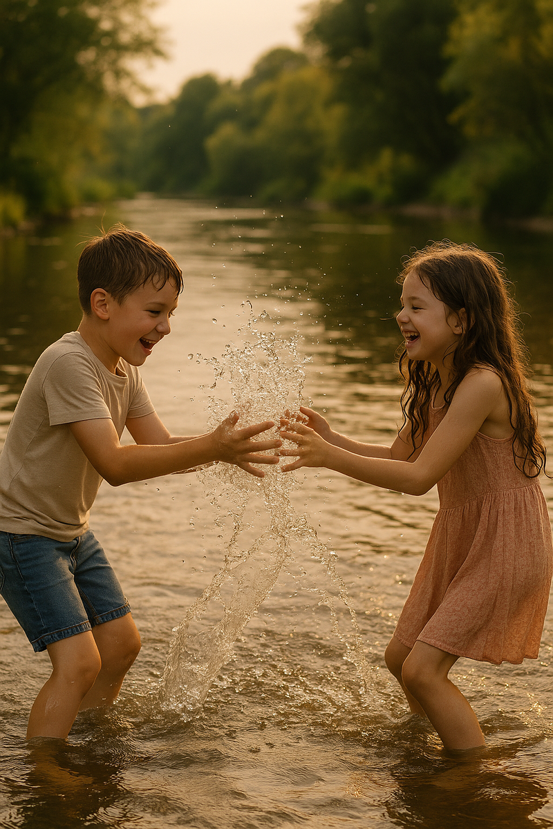— А можно сделать из фото такую картину, как будто это не просто игра… а магия? — спросила мама, сжимая в руке снимок, от которого пахло летом. — Они там не просто плещутся в речке. Они управляют водой. Они герои. Только сами об этом пока не знают. 📸 На фото — мальчик и девочка, по колено в речке, весь мир в их брызгах и смехе. Она — в лёгком платье, волосы как русалочий водопад. Он — в мокрой футболке, с лицом победителя чемпионата по счастью. Между ними — всплеск, похожий на водяную радугу. Солнце садится, но в них — всё только начинается. 👩👦 — Это было их тайное место. Летом они туда сбегали «управлять стихиями». А теперь мы переезжаем, и я хочу, чтобы этот миг остался с ними. Навсегда. 🎨 На картине: