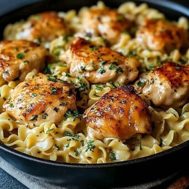Курица с маслом и лапшой в одной сковороде Ингредиенты: * 2 куриных грудки без костей и кожи * 225 г яичной лапши * 2 столовые ложки оливкового масла * 2 столовые ложки сливочного масла * 1 луковица, нарезанная * 2 зубчика чеснока, измельченных * 1 стакан куриного бульона * ½ стакана жирных сливок * 1 чайная ложка сухого тимьяна * 1 чайная ложка сухой петрушки * Соль и перец по вкусу Приготовление: 1. Разогрейте оливковое масло в большой сковороде на среднем огне. Посолите и поперчите куриные грудки, затем готовьте по 5-7 минут с каждой стороны или до полной готовности. Выньте курицу из сковороды и отложите в сторону. 2. В той же сковороде растопите сливочное масло и обжарьте нарезанный лук и измельченный чеснок в течение 2-3 минут до появления аромата. 3. Добавьте куриный бульон и доведите до слабого кипения. Влейте сливки, добавьте тимьян и петрушку. 4. Добавьте яичную лапшу в сковороду, перемешайте. Накройте крышкой и готовьте 8-10 минут, или пока лапша не станет мягкой, а соус