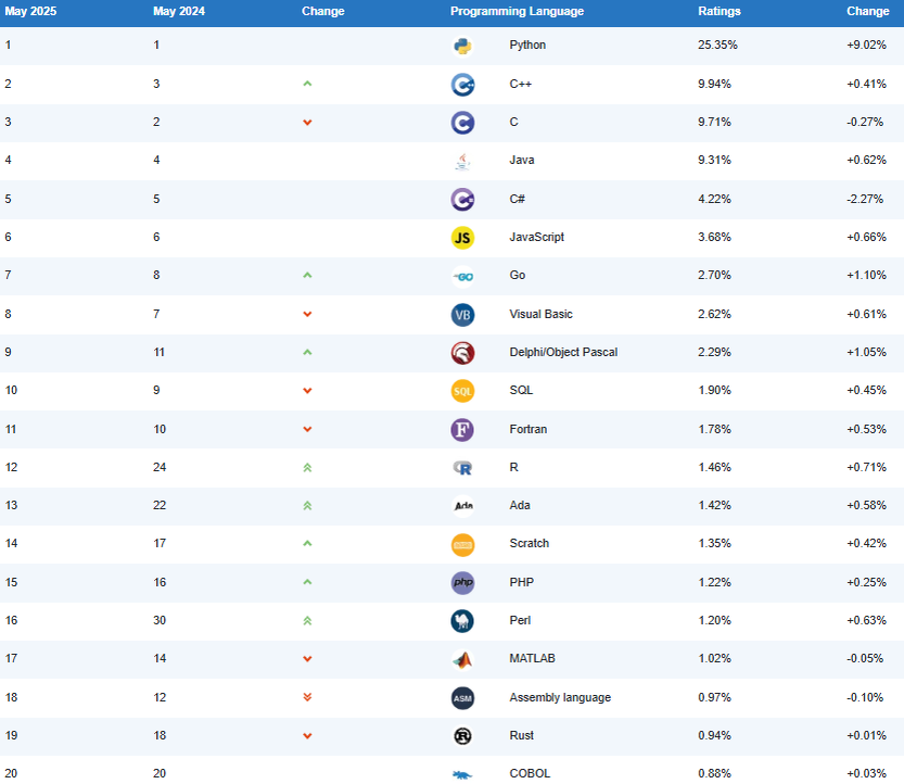 Популярность Python увеличилась еще на внушительные 2,2% за прошлый месяц, достигнув в общей сложности 25,35%. Эти 25,35% — самая высокая доля, которую когда-либо имел язык программирования в истории индекса TIOBE, за исключением Java в июне 2001 года (первый месяц существования индекса TIOBE, когда отслеживалось гораздо меньше языков) и октября 2001 года. Python также побил другой рекорд: это первый случай, когда язык имел такое большое преимущество над остальными — более чем на 15% по сравнению со вторым местом, которым является C++. Единственная причина, по которой другие языки всё ещё существуют — это низкая производительность Python, а также то, что он интерпретируемый и, следовательно, подвержен неожиданным ошибкам во время выполнения. Это означает, что для систем, критичных к безопасности и/или работающих в реальном времени, всё ещё приходится полагаться на другие языки, но в большинстве других областей Python медленно, но уверенно пробивается на вершину.