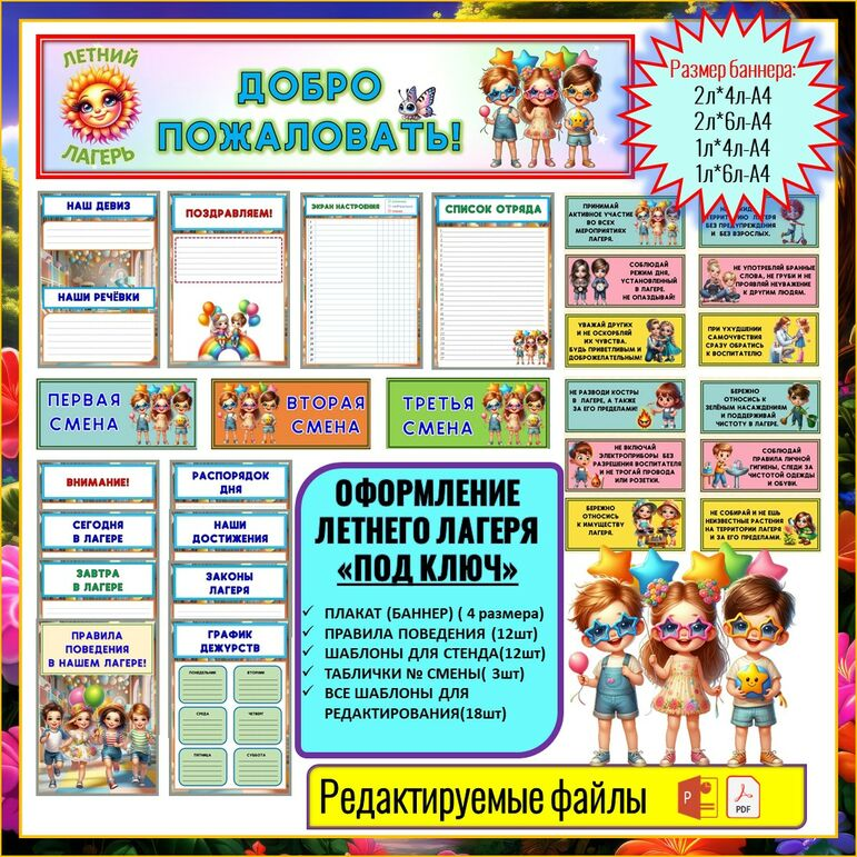 Ознакомиться и скачать можно здесь Пришкольный летний лагерь. Готовое универсальное оформление + редактируемые шаблоны для Вашей фантазии. Большой и яркий набор Состав набора: 1.Шаблоны для стенда, редактируемые: 2.Плакат ( баннер).Формат pdf РАЗМЕРЫ ПЛАКАТА ( Баннера): 1 лист на 4 листа формат А4 ( листы для склеивания, с припуском) 1 лист на 6 листов формат А4 ( листы для склеивания, с припуском) 2 листа на 4 листа формат А4 ( листы для склеивания,с припуском) 2 листа на 6 листов формат А4 ( листы для склеивания, с припуском) Все файлы ( кроме плаката) Вы можете отредактировать Напечатайте нужную информацию в шаблоны ( файл pptx. прикреплён для редактирования), измените цвет надписей по желанию и др. Далее необходимо сохранить в формате pdf и отправить готовый файл на печать.
