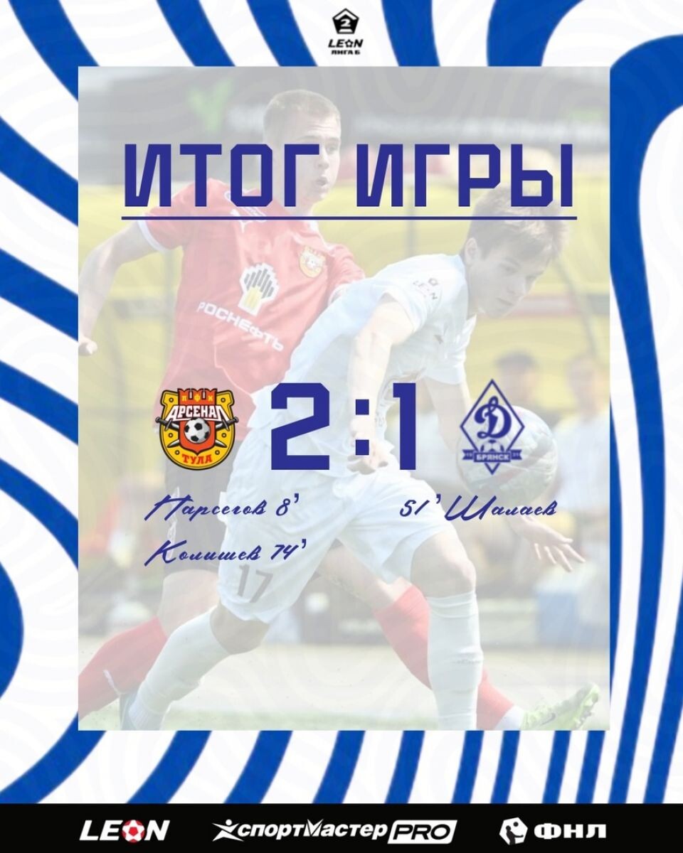 В Туле завершился матч девятого тура Второй лиги по футболу, в котором встречались местный «Арсенал-2» и «Динамо Брянск». К сожалению, наша команда уступила со счётом 1:2. Счёт в матче открыли хозяева - на 8-й минуте отличился полузащитник «Арсенала» Борис Парсегов. «Динамо» смогли сравнять счёт во втором тайме - гол забил Олег Шалаев. Но «Арсенал» усилиями Колышева на 73-й минуте установил окончательный счёт в игре - 2:1 в пользу «Арсенала-2». В следующем туре «Динамо Брянск» 31 мая сыграет на выезде против московского «Строгино». 6+