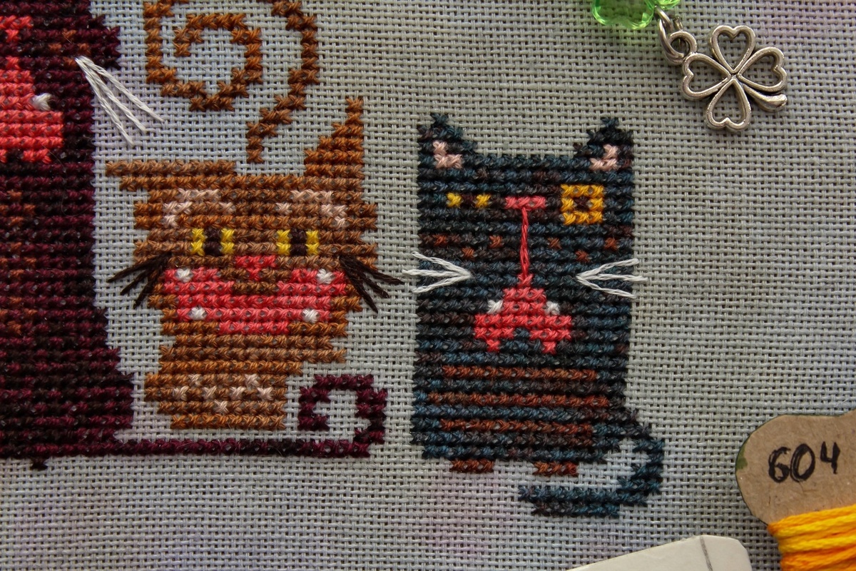 На самом этот сюжет называется «Кошачий концерт», но у меня он шёл под кодовым названием «кото-моськи», потому что выражение мордах у них просто бесподобно. Думаю, если у Вас дома живут котики, вы меня прекрасно понимаете! Когда говорят о вышивке мулине секционного окрашивания, я сразу представляю полосатые элементы сюжета. Просто потому, что такими нитками чаще всего вышивают именно горизонтальными рядами. Но мне такой эффект редко нравится, поэтому я предпочитаю идти хаотичными кусочками, форма и расположение которых зависят от вышиваемого элемента. Но когда я брала в работу этих котов, мне почему-то захотелось именно полосатости. Однако сложилось всё совсем наоборот. В этой работе в основном используются мулине моего собственного окрашивания и всего два цвета от Кудесницы. Вот только я забыла о том, что окрашивала нитки хаотично, специально стараясь избегать полосатости и потому, как бы я не вела ниточку по сюжету, того самого эффекта у меня не получилось. Конечно же, коты от этого