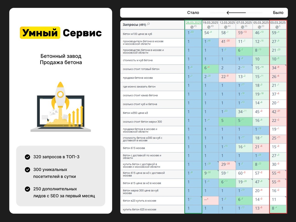🔥 Кейс: SEO-прорыв бетонного завода — вышел в ТОП-3 и увеличил продажи в 5 раз Основные проблемы до начала работы с УмныйСервисом: ❌Большое количество коммерческих запросов находилось за пределами ТОП-10. ❌Низкий уровень органического трафика. ❌Недостаточное количество заявок с сайта. Результаты через месяц: 🏆 Запросы в ТОП-3: с 11 → до 320 (+2809%) 📈 Трафик: с 50 → до 300 посетителей/день (+500%) 💰 Заявки: с 20 → до 250 в месяц (+1150%) Что изменилось? ✅Значительное улучшение позиций по ключевым запросам («бетон с доставкой», «бетон м100 цена за куб», «сколько стоит готовый бетон», «купить бетон в Москве»). ✅Существенный рост органического трафика и увеличение количества целевых заявок уже в первый месяц после подключения к УмныйСервис. ✅Клиенту не пришлось тратить время на сложный запуск и ожидание результатов. 🤫Даже в сезон такие ниши можно выводить в ТОП и при этом тратить меньше на рекламу, что делает ваш бизнес более устойчивым и прибыльным. Итог какой? Хотите больше за