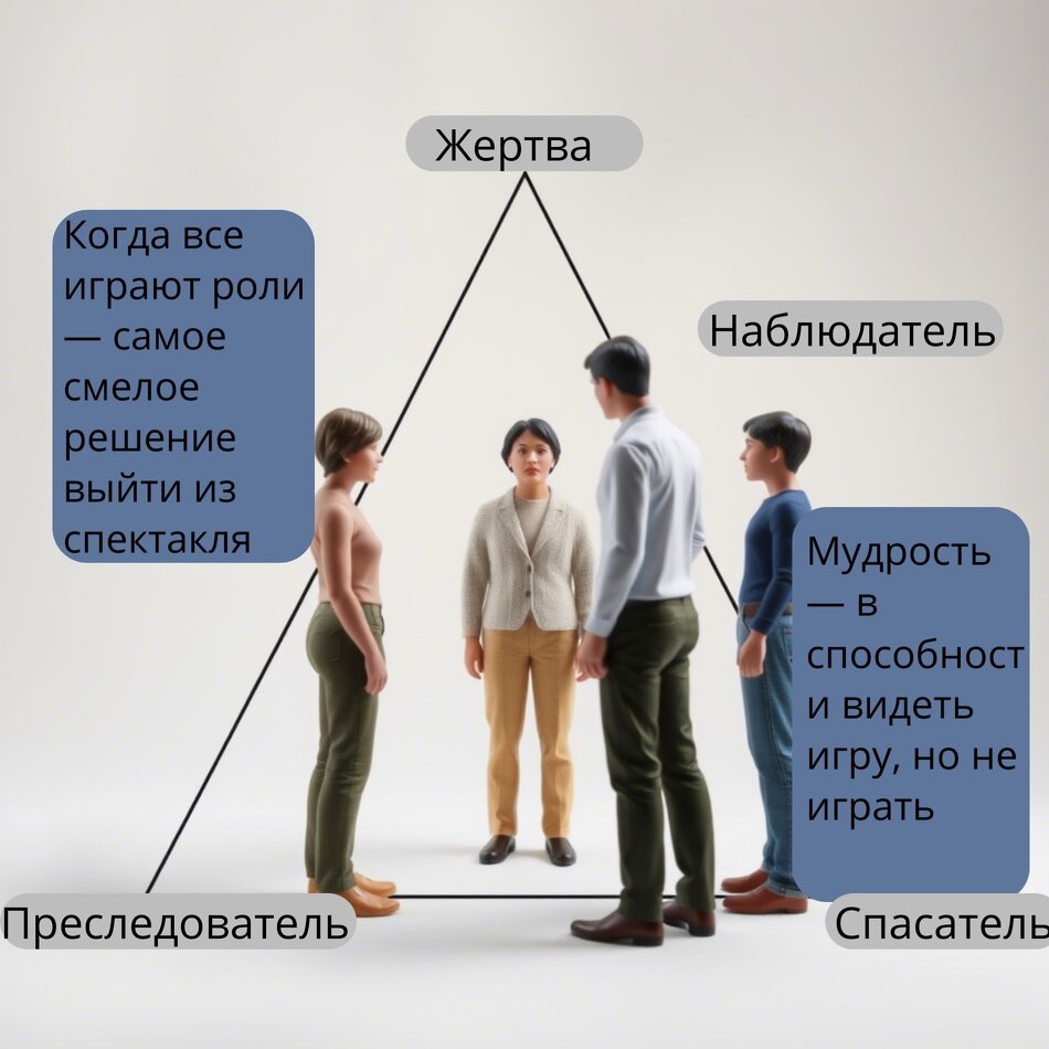 Вы когда-нибудь замечали в токсичных отношениях человека, который стоит особняком? Того, кто не бросается спасать, не ноет о несправедливости и не обвиняет других? В классическом треугольнике Жертва-Спасатель-Преследователь есть неучтённая роль — Наблюдатель-Мудрец. И именно он, вопреки расхожему мнению, может быть самым здоровым участником системы. Разберём классику с научной точки зрения