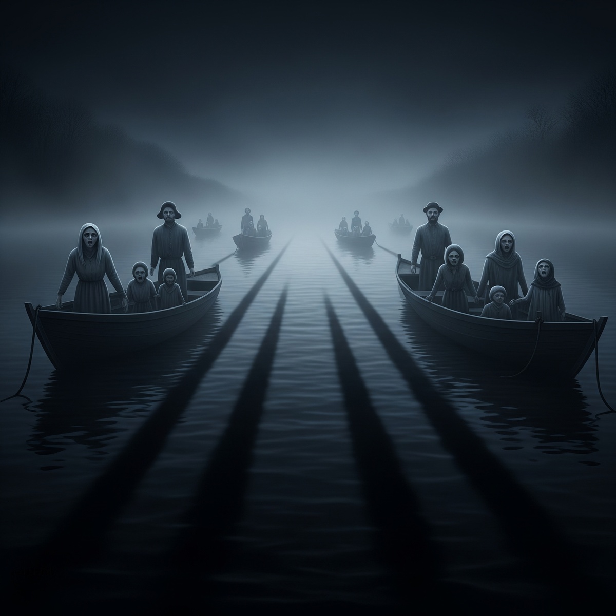 Прямо из тумана, бесшумно, как тени, начали выплывать лодки. Старые, просмоленные, с высокими, заостренными носами, такие, на каких здесь плавали, наверное, еще в прошлом веке, а то и раньше. А в лодках сидели люди. Бледные, почти полупрозрачные фигуры в истлевшей, темной одежде – посконные рубахи, лапти, платки на женщинах. Их лица были искажены невыразимым страданием, а глаза… глаза были пустыми, темными провалами, из которых, казалось, сочилась сама речная вода, холодная и безжизненная. Они гребли медленно, их весла беззвучно рассекали черную, маслянистую воду, а пение, тот самый душераздирающий, потусторонний хор, исходило будто от них самих, от их призрачных тел, сливаясь в единый, бесконечный реквием по загубленным жизням.