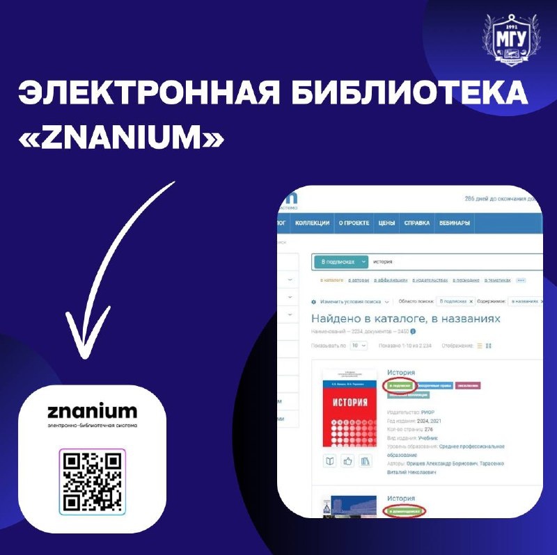 Электронная библиотечная система Znanium — цифровая коллекция современных образовательных и научных изданий, доступ к которой имеет Научная библиотека МГУ имени А.И. Куинджи. Доступ ко всем изданиям (около 79 тыс. документов) действует до 18 июня 2025 года. Использовать материалы коллекции можно двумя способами: с устройств, подключенных к локальной сети университета, в том числе по Wi-Fi; из любой точки подключения Интернет после регистрации. Важно! Прочтение изданий, предоставленных в тестовом режиме, не стоит откладывать. После авторизации в ЭБС отличить их от изданий, доступных по подписке, легко: в описании – пометка «в демоподписке». Подписка на основную коллекцию ЭБС «Znanium» и коллекцию «ЮНИТИ ДАНА» (более 51,5 тыс. документов) действует до марта 2026 г. Готовьтесь к сессии вместе с Научной библиотекой МГУ имени А.И. Куинджи