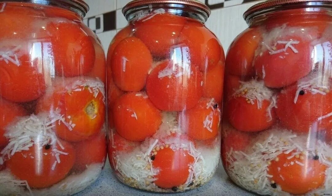 Малосольные помидоры быстрые Ингредиенты: Перец черный горошек - 2 штуки Перец душистый - 2 штуки Укроп - 1 пучок Хрен - 0,5 штуки Чеснок - 2 зубчика Соль - 1,5 столовые ложки Томат (помидор) красный - 1 килограмм. Приготовление Все указанное количество ингредиентов рассчитано на 1 литр готового продукта! 1. Мытые помидоры укладываем в банку. Постарайтесь выбрать мелкие и зрелые томаты. 2. В каждую из банок добавляем укроп вместе со стеблями, листья черной смородины (2-3, не больше ) и хрен. 3. Добавим также несколько долек чеснока и перчик. 4. Рассол для наших помидоров готовим так. Мерки соли и сахара в него кладут, исходя из объема: на литр нужно 1,5 столовые ложки соли, а сахара - одну чайную. 5. Варим рассол и охлаждаем немного, после чего заливаем его в банку к томатам. 6. Закрываем банки крышкой. Малосольные помидоры быстрые готовы к употреблению уже через двое суток. Домашние помидоры, консервированные с чесноком Ингредиенты: Чеснок - 5 зубчиков Укроп - 10 грамм