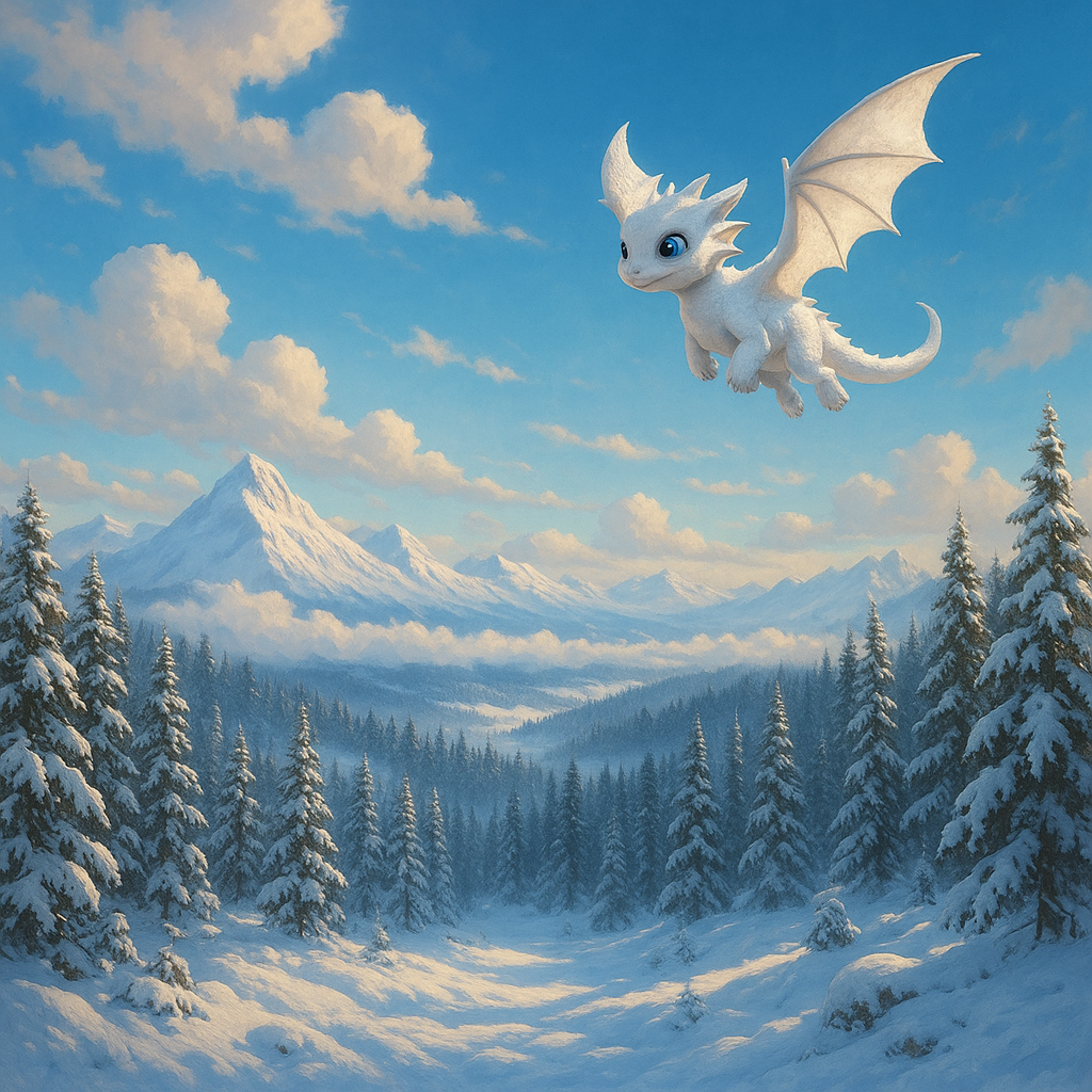Жил-был маленький белый дракончик по имени Снежик. Он был не больше большого котёнка, с блестящей чешуёй, похожей на иней, и глазами цвета утреннего неба. Снежик родился высоко в горах, где вечные снега и ледяные ветра были его родным домом. Его семья жила в ледяной пещере, спрятанной среди скал, и каждое утро мама-дракониха учила его летать и дышать морозом. Однажды, увлечённый погоней за снежинкой, Снежик улетел слишком далеко от дома. Ветер усилился, облака затянули небо, и малыш потерял из виду горы. Он долго кружил в воздухе, звал маму, но ответа не было. Уставший и замёрзший, он опустился в густой лес у подножия гор. Снежик спрятался под корнями большого дерева и тихонько всхлипывал. Его дыхание превращалось в серебристый иней, а сердце стучало от страха. Он не знал, что делать, и чувствовал себя таким одиноким… Но в это время по лесу шла девочка по имени Лея. Она собирала хворост для костра, когда вдруг услышала странное посапывание. Осторожно раздвинув ветви, она увидела крошеч