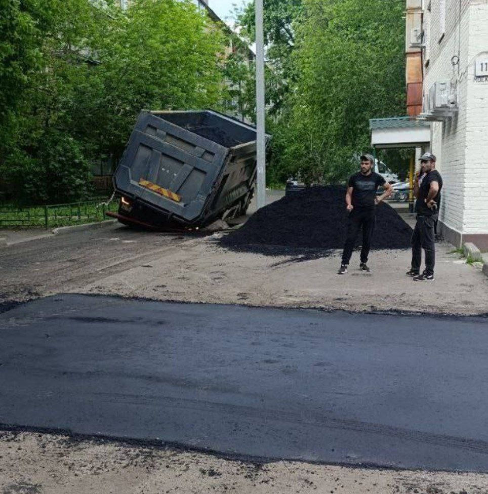 Обстановка в Пушкино. Асфальт не выдержал веса грузовичка с асфальтом.