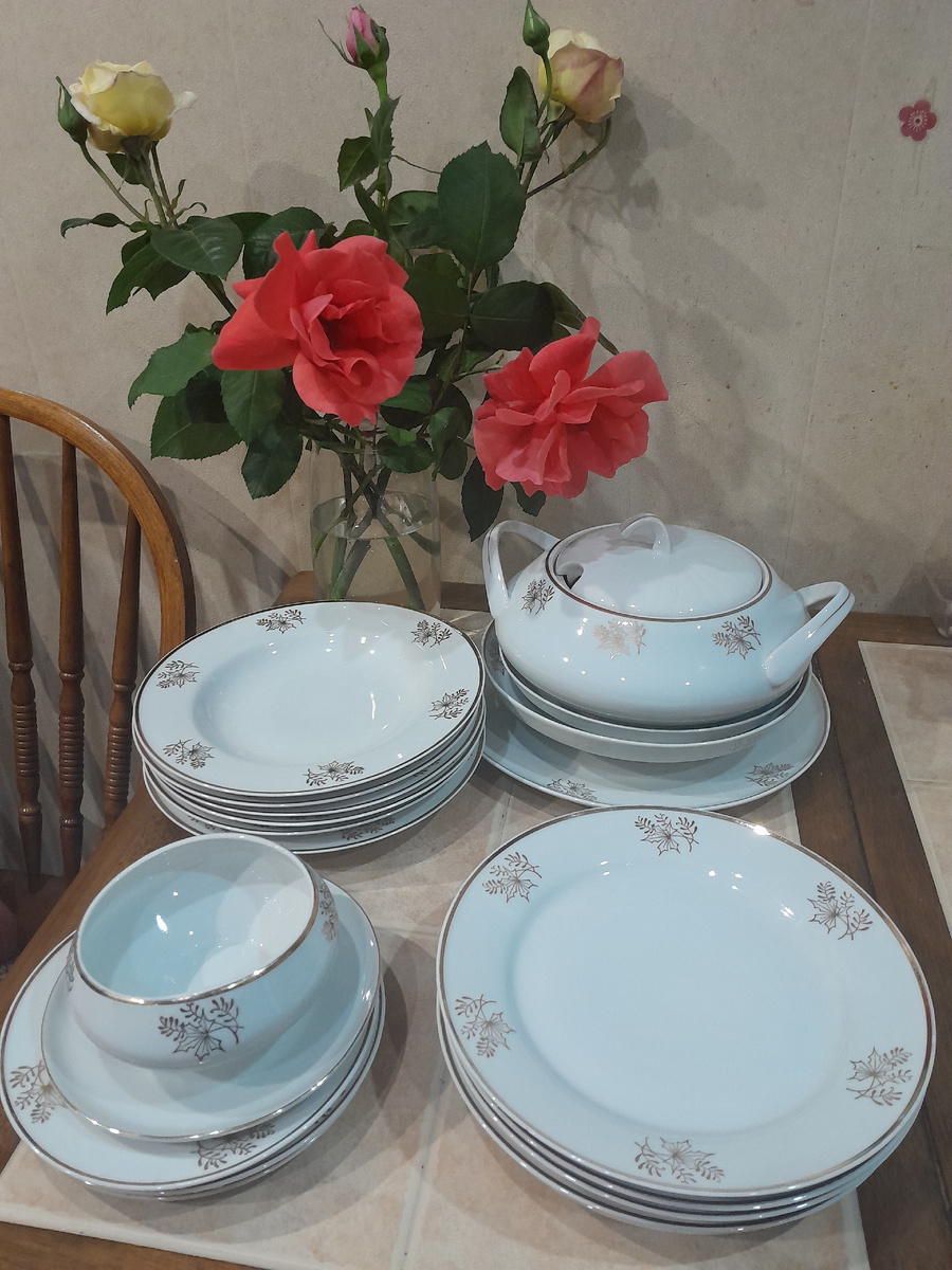 Друзья! Я давно, понемногу, собираю интересную посуду, ту посуду, у которой точно есть история..... Пусть она и не представляет особой ценности, но она уже ценна тем, что она вся старше меня, а иногда и старше моих родителей и даже бабушек и дедушек. Т.е. ей минимум 60 лет и больше. Сегодня я хочу вам рассказать о Чешском сервизе, который много повидал, возможно и ВОВ тоже. Почему возможно, да потому, что доподлинно так и не удалось установить его возраст. Судя по стилистике, где- то между 40- 50 годами прошлого века. Каталоги клейм Чешского фарфора очень разрознены, в них много путаницы, местами они не велись совсем. Теперь об истории сервиза, где- то примерно 10 лет назад пролистывая Авито я наткнулась на этот сервиз, а т.к. глаз был уже намётан, сразу поняла, не простой. Связалась с хозяином, оговорила детали, задала несколько вопросов, один из них удивил его, я попросила посмотреть на свет фарфор! Вы поняли , о чём я? Я хотела удостовериться, что речь идёт о сервизе из костяного ф