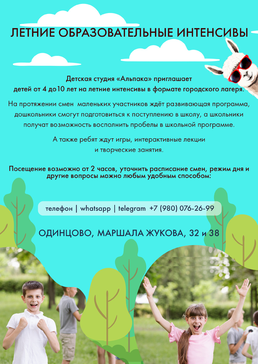 Детская студия «Альпака» приглашает детей от 4 до 10 лет на летние интенсивы в формате летнего городского лагеря. На протяжении смен маленьких участников ждёт развивающая программа, дошкольники смогут подготовиться к поступлению в школу, а школьники получат возможность восполнить пробелы в школьной программе. А также ребят ждут игры, интерактивные лекции и творческие занятия. Мы находимся в центре города Одинцово, по адресу: ул. Маршала Жукова, д. 32 Уточнить любые вопросы и записаться на занятия можно любым удобным способом: телефон | whatsapp | telegram +7 (980) 076 26 99