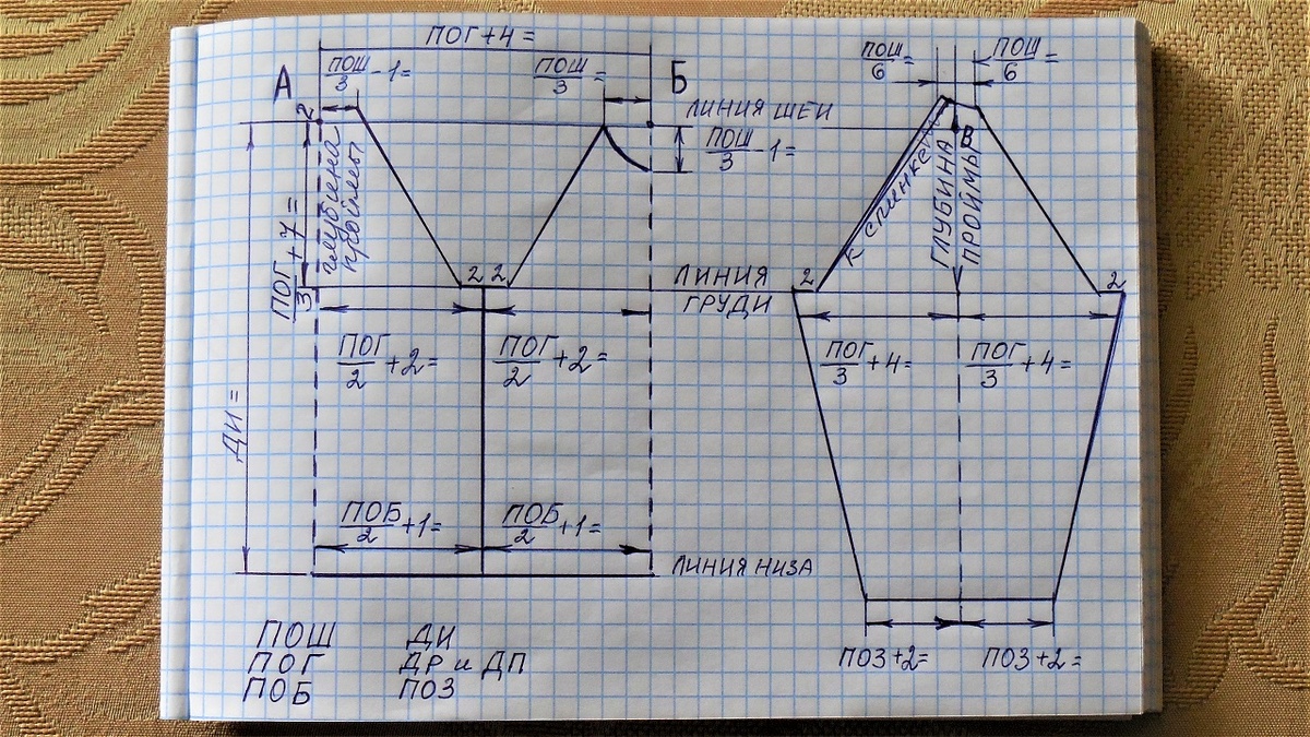 РЕГЛАН СНИЗУ. ПОСТРОЕНИЕ ВЫКРОЙКИ-ОСНОВЫ С РУКАВАМИ РЕГЛАН НА ЖЕНСКУЮ ФИГУРУ ДЛЯ ВЯЗАНЫХ ИЗДЕЛИЙ. Рассмотрим простой способ построения выкройки-основы с рукавами реглан на женскую фигуру для вязаных изделий. Модели с рукавами реглан можно рекомендовать для фигур всех размеров, исключая лишь тех, у кого слишком узкие и покатые плечи. Не секрет, что многие вяжут на глаз и я очень надеюсь, что этот способ будет Вам полезен. Каждый сможет построить чертеж, ничего сложного в этом нет. Для этого нужно снять минимальное количество мерок. Нужны будут: ПОШ (полуохват шеи), ПОГ (полуохват груди), ПОБ (полуохват бедер), ДИ (длина изделия), ДР (длина рукава) и ДП (длина плеча) – это одна мерка, ПОЗ (полуохват запястья). Переходим к построению выкройки. В верхнем левом углу ставим точку "А" и от нее по горизонтали откладывает величину равную ПОГ+4 см. 4 см. – это припуск на свободу облегания, он нужен для основы выкройки. Если нам нужно построить выкройку для свободного силуэта, то эта величина ес