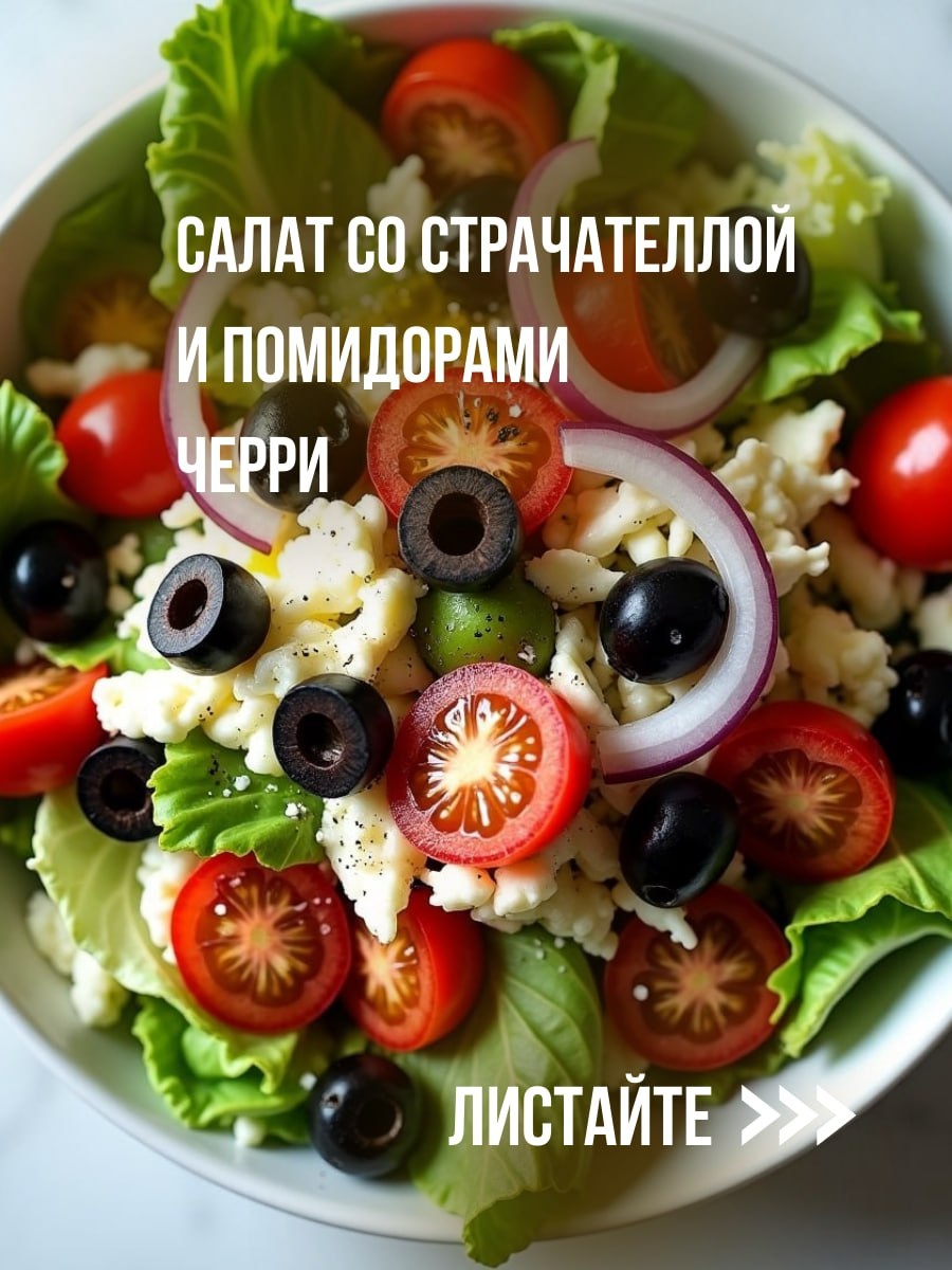 Салат со страчателлой и помидорами черри У нас для вас отличный рецепт на лето – легкий салат со Страчателлой. Готовится за 10 минут, съедается — за 3. Идеально к обеду, ужину или когда просто хочется вкусно и красиво поесть.