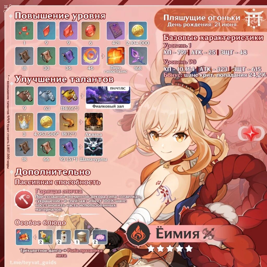 ㅤ☀ Основной урон Ёимии заключается в её обычных атаках, поэтому стоит прокачивать их в первую очередь. ㅤДалее следует прокачивать элементальный навык, так как он дополнительно увеличивает урон обычных атак во время своего действия.