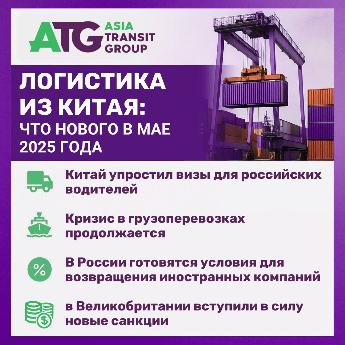 Логистика из Китая и не только: что нового в мае 2025? ⚡️ Китай упростил визы для российских водителей — теперь проще и быстрее пересекать границу. Срок визы — до 1 года, пребывание — до 30 дней. Это нововведение направлено на снижение административных барьеров и сокращение времени ожидания на пограничных переходах, где ранее фуры могли простаивать до 5–7 дней из-за визовых и таможенных процедур ⚡️ Кризис в сфере грузоперевозок, начавшийся в 2024 году, продолжает углубляться в апреле и мае 2025 года. Это приводит к росту тарифов на перевозки, особенно в контейнерных и железнодорожных сегментах ⚡️ Готовятся условия для возвращения иностранных компаний в РФ — возможны сдвиги в логистических цепочках и инвестициях ⚡️ С 14 мая 2025 года в Великобритании вступили в силу новые санкции, которые могут повлиять на логистические операции, связанные с международными перевозками и торговлей А наша компания адаптируется к новым вызовам, чтобы предоставлять качественные услуги на лучших условия