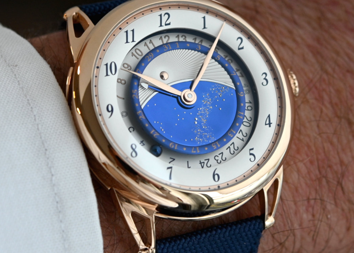 Затем - центральный диск Starry Varius из титана с термическим напылением. Кроме того, на двухцветном 24-часовом кольце расположены сферические индикаторы GMT и день/ночь. И в завершение - прыгающий указатель даты. И, конечно же, великолепный механизм! Часы носятся на темно-синем кожаном ремешке с золотой застежкой, цена - только по запросу.