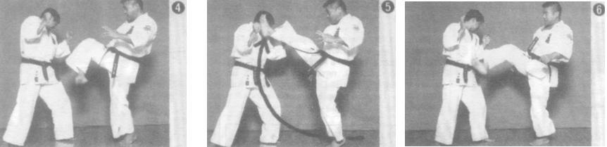 - Поднимите колено к груди, развернув бедро внутрь — будто прячете ногу за «занавесом» тела (это маскирует атаку).