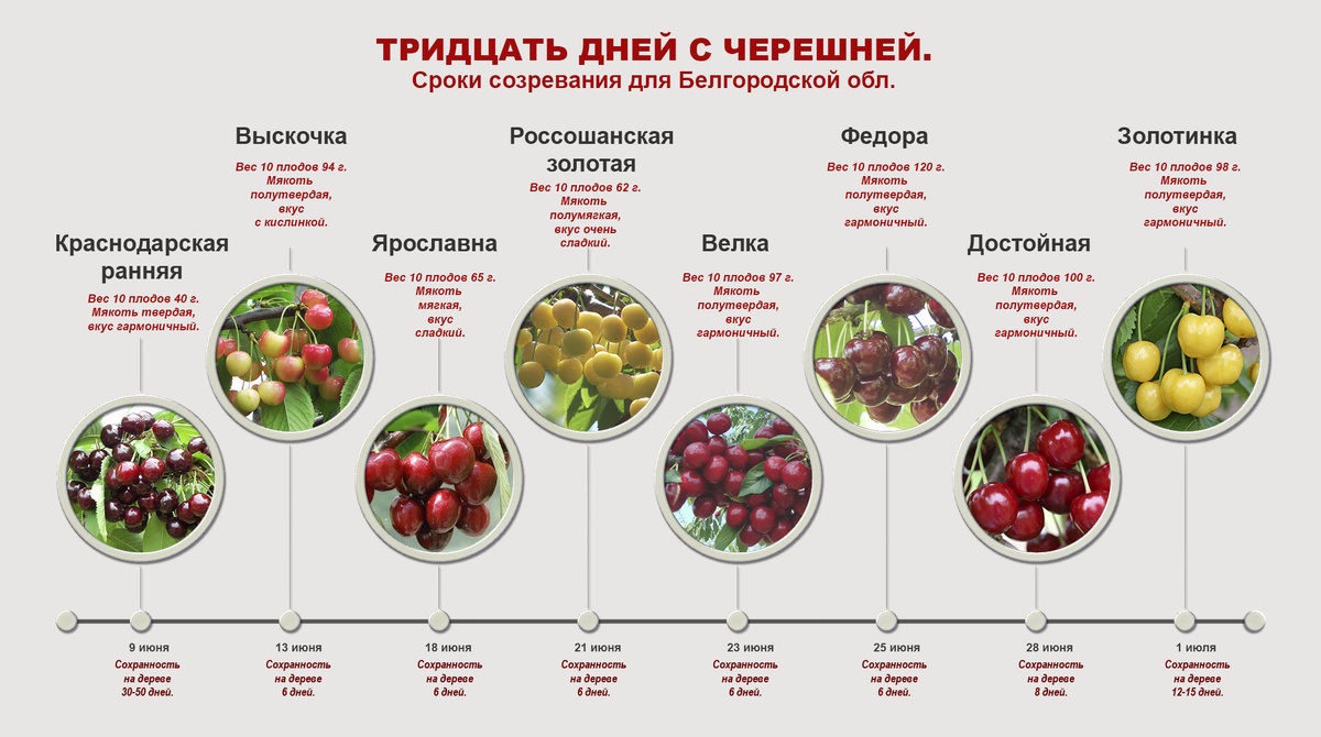 Точных сроков созревания сортов черешни не существует. Каждый год особенный и поэтому сроки созревания могут отклоняться на несколько дней в ту или иную сторону. На инфо графике указаны усредненные сроки по годам, а на таблице точные сроки созревания сортов черешни, зафиксированные в «ООО Агрофирма «Росток» в 2017 году. Весна и лето 2017 года были благоприятные для черешни, и она отблагодарила почти 50 днями с урожаем. Обычно плодоношение черешни в нашей местности укладывается в 33-37 дней.