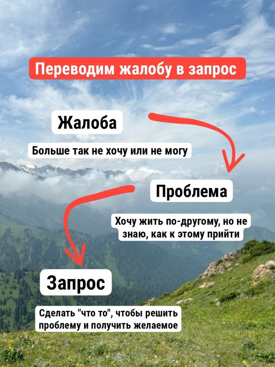 Итак, какие же запросы считаются конструктивными и какие не конструктивными. 🔹Конструктивные (адекватные, выполнимые). Например👇: ✅ Избавиться от негативных убеждений (у меня не получится, деньги зло, я не красивая и тд) ✅ Снять симптом, решить проблему (перестать бояться, тревожиться, паниковать, злиться или наоборот стать уверенным, спокойным) Эти вопросы решаются при активном участии у психолога и клиента, они звучат как цель, предполагают достижение конкретного результата, который находится в зоне ответственности клиента. 🔹 Не конструктивные (которые нельзя выполнить, мистические) Например👇 🚫 Невыполнимые результаты: "Хочу чтобы дети меня всегда слушались" "Хочу ни о чем никогда не переживать" В этих случаях я не смогу сделать так чтобы ребёнок всегда слушался или человек ни о чем никогда не переживал. Зато я могу помочь вам изменить своё отношение к ребёнку или тем проблемам из за которых вы испытываете стресс. 🚫 Манипуляционные запросы: "Как заставить его жениться