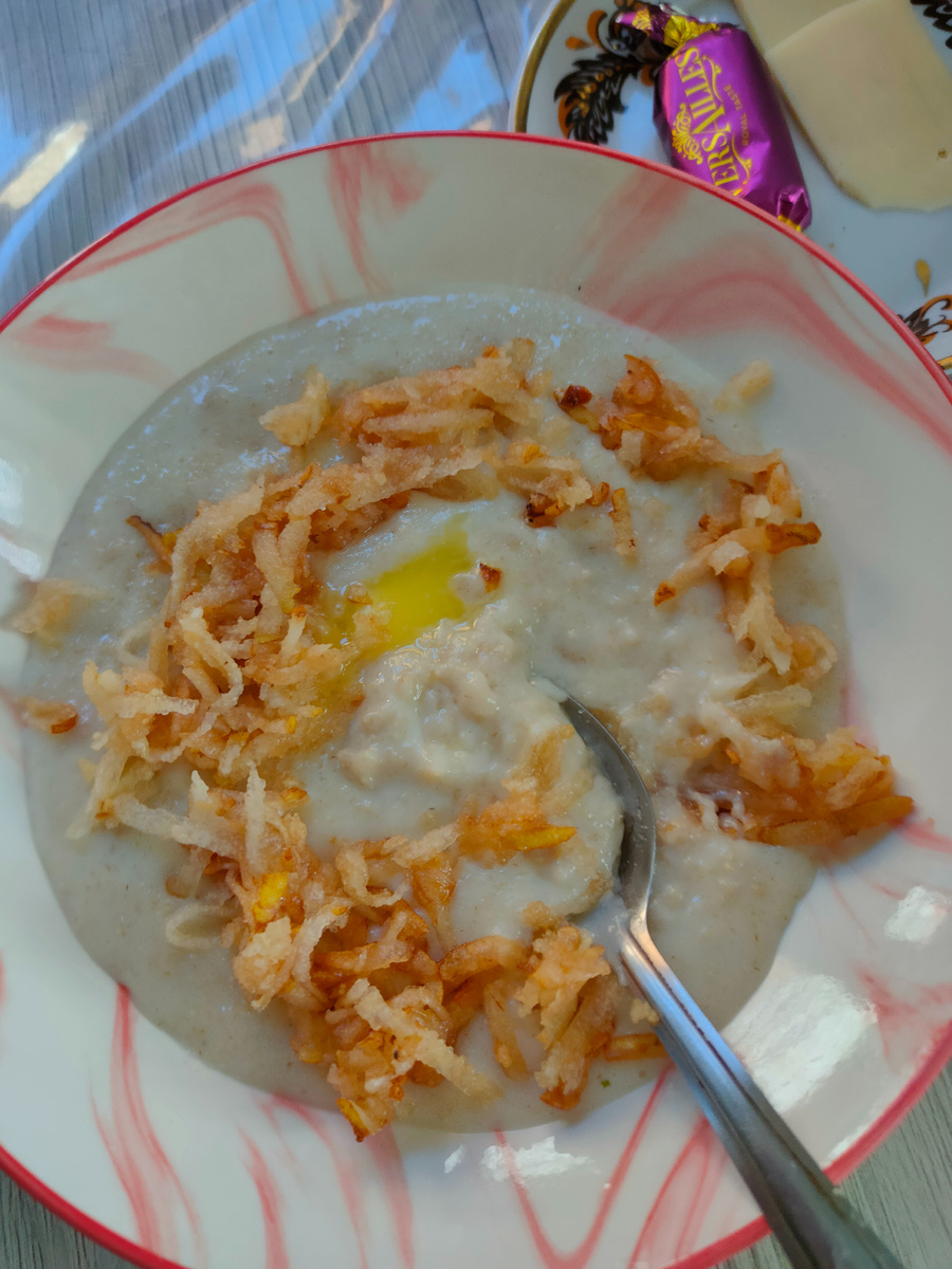 Ели ее с маслом и тертой грушей, а также сварила в турке черный натуральный кофе, к кофе была шоколадная конфета Версаль и ломтики сыра.