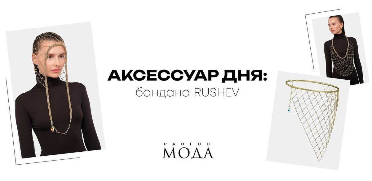 Если в вашей жизни ещё не хватало аксессуара, который одновременно выглядит как артефакт с модного алтаря и ловца снов — вот она, бандана RUSHEV. Сетка из цепей обвивает голову (и не только) с особой грацией высокой моды. Срочно в вишлист! #РазгонМода_ВещьДня