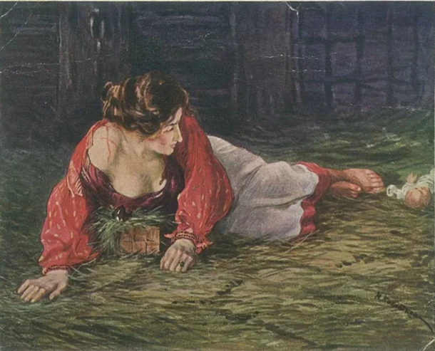 На плечах у женщины следы от плети или кнута, то есть её недавно били. В ногах у неё лежит её грудной младенец, до которого она не может дотянуться, чтобы покормить, видимо прикована.