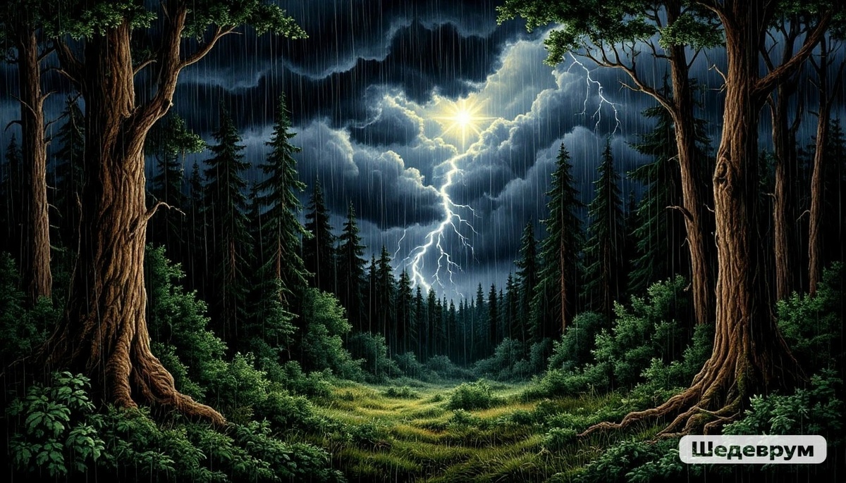 Огромная чёрная туча закрыла небо. Налетел холодный сильный ветер. Вдали загрохотал гром.