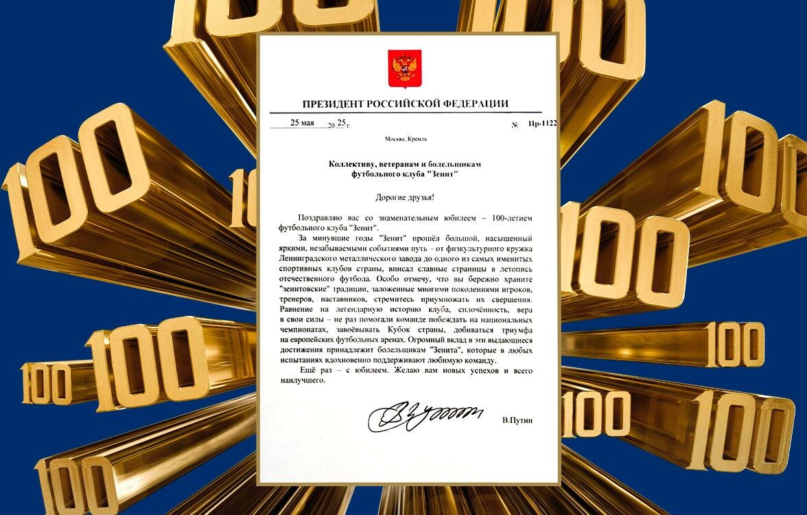 ❗️ Владимир Путин направил поздравительную телеграмму футбольному клубу «Зенит» по случаю 100-летнего юбилея