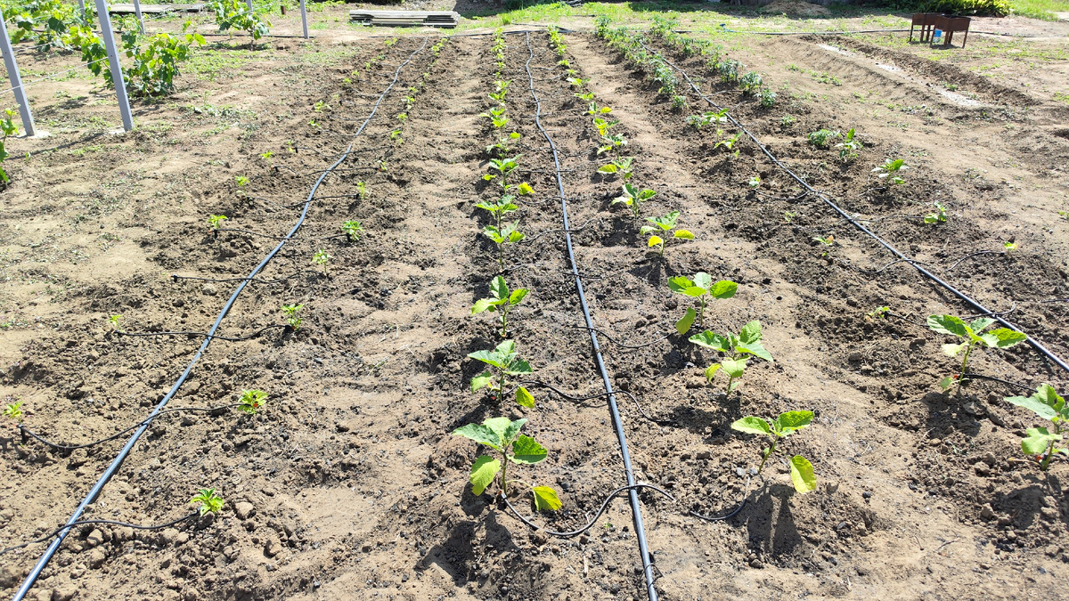 Выходные прошли азартно и спортивно!! Проводить садово- огородные работы уворачиваясь от укусов мошки ,тот ещё спорт!! В воскресенье ветерок был более свежий, и очень помогал разгоняя надоедливых мошек. Да и по температуре сегодня было более комфортно. +27 против +33 в субботу. Света приводила в порядок томаты. Подвязывала низкорослые к колышкам, убирала пасынки. А так же перец и баклажаны В этом сезоне для колышков прикупил рулон композитной арматуры 10 мм. Пока все устраивает. Отлично входит в землю, не ломается, не гниёт, хорошо держит шпагат за счёт своей шершавости. Вечные колышки!! Я сегодня опять бинтовал капельную ленту, главные вредители это птицы. Они нещадно ее расклевывают ,что бы пить воду. В следующий сезон буду прятать ленту под пленкой. Не зря это делают на полях фермеры. Прополол последний участок с картофелем , окучивать его ещё рано, дней через 10 примерно, всходы ещё маленькие. Оля продолжала колдовать над виноградом, наш виноградник мне все больше нравится. В