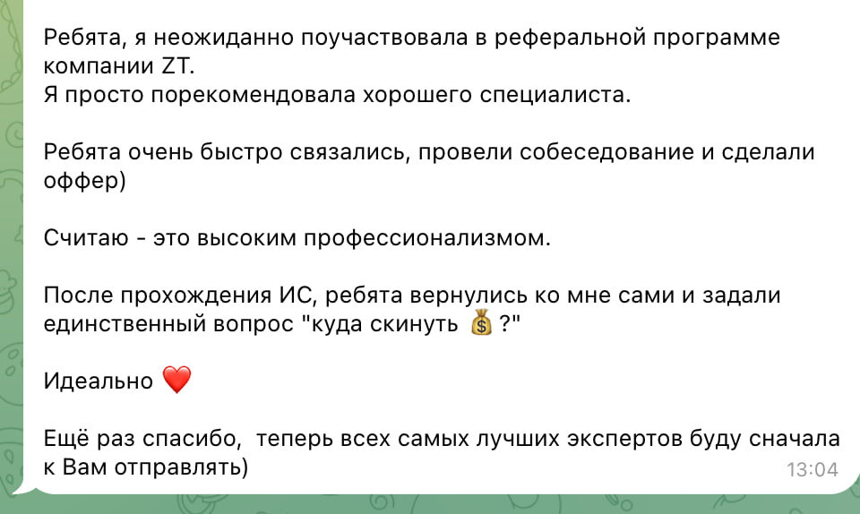 Читайте отзыв 👆 Кто-то решил сколотить капитал на поставке сотрудников в ZT 😁 А мы напоминаем, что вы можете не только найти себе работу, а пригласить друга — и получить за это до 60 000 рублей! Всего за 2 шага: 1️⃣ Зовёте друга или знакомого на любую открытую вакансию 2️⃣ Он проходит отбор, выходит на работу, а вам — приятный бонус в карман 🚀 Выплата — после прохождения испытательного! Если у вас есть знакомый, друг или родственник, который ищет работу — предложите ему любую из наших горячих вакансий https://t.me/Ztcjob