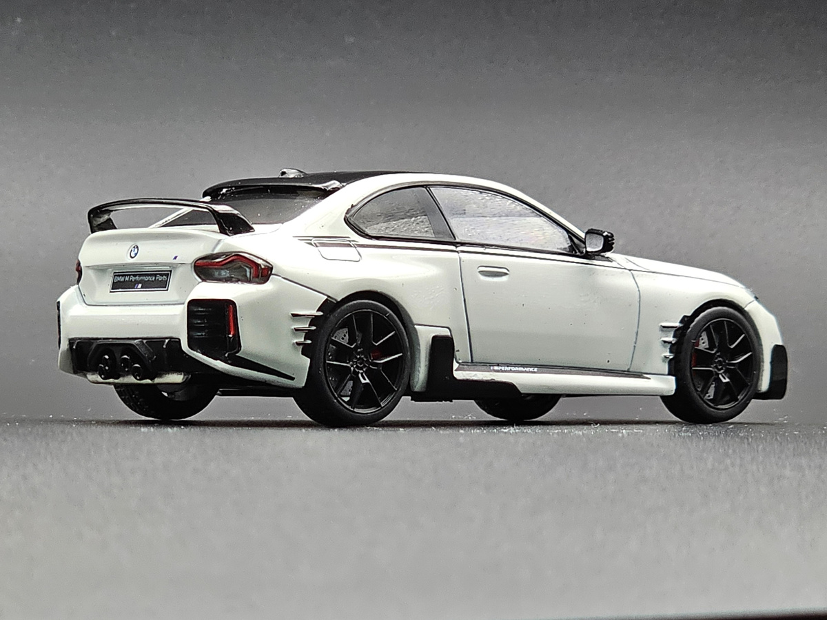 Краткий обзор на новинки этой весны BMW M2 G87 M Performance (2023) от компании Solido в масштабе 1/43. Немного о прототипе BMW M2 G87 M Performance (о М2 G87 в базовой версии расскажу как выйдет модель от фирмы Minichamps): Если вы находите новый M2 G87 немного обыденным с точки зрения внешнего вида, BMW уже разработала широкий спектр деталей M Performance. Они придают спортивному купе гораздо более агрессивный вид практически с любого ракурса. Самые большие изменения на самом деле сзади, где система выхлопа Quad имеет центрально установленные сложенные наконечники, похожие на более крупные M3 и M4. Новый M2 поставляется с завода с тонким спойлером на крышке багажника, который выглядит не больше, чем тот, что установлен на M240i . Более заметное аэродинамическое решение, доступное за дополнительную плату, — это крыло из углеродного волокна, которое может быть дополнено мощным спойлером, установленным на крыше. Каталог деталей M Performance также включает в себя акценты из углеродного