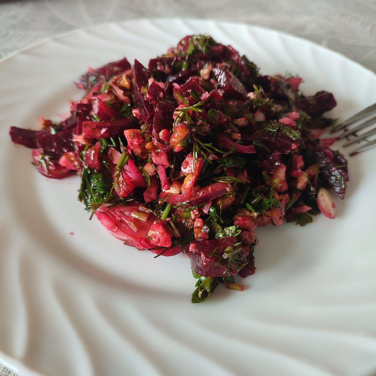 Хочу поделиться с вами рецептом вкусного салата. Мне его прислала сестра незадолго до моего дня рождения, я поняла намёк 😂😉 Приготовила, нам очень понравилось! Повторяла его уже неоднократно. Самое сложное и главное в нем - найти действительно сладкую и вкусную свёклу. #непрохлеб Салат свекольный, грузинский Свекла 2 крупные или 4-5 мелких Запечь в фольге, в духовке при +190+200, полтора часа Красный сладкий лук (лучше ялтинский ) 1 шт Соль - полчайной ложки, Паприка - чайная ложка Хмели сунели чайная ложка Оливковое масло, немного Сок половинки лимона Грецкие орехи 100 г. Кинза,укроп, петрушка - поровну (суммарно большой пучок) Чеснок 2-3 зубчика Лук, зелень порезать, орехи порубить, выдавить чеснок, добавить специи, масло, лимонный сок, оставить мариноваться на 1 час. Испечённой свекле дать остыть, почистить, порезать соломкой, добавить к остальным ингредиентам, перемешать. Готово!