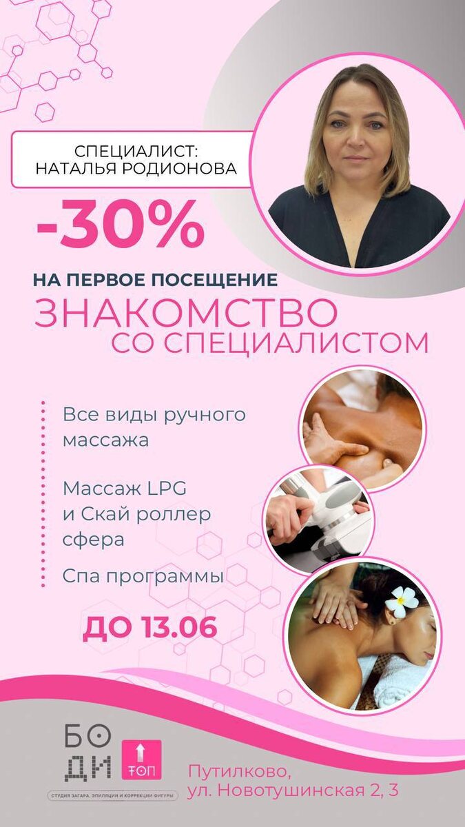 🌸 Специальное предложение от Натальи Родионовой! 🌸 📅 Акция: -30% на первое посещение 🕒 Срок действия: до 13.06 🤝 Познакомьтесь с экспертом в области массажа! ✅ Услуги: - Все виды ручного массажа - Массаж LPG и Скай роллер - Спа программы 📍 Адрес: ул. Новотушинская 2, 3 Подарите себе момент расслабления и ухода за собой! Записывайтесь на сеансы! 📞🌟 https://n960947.yclients.com
