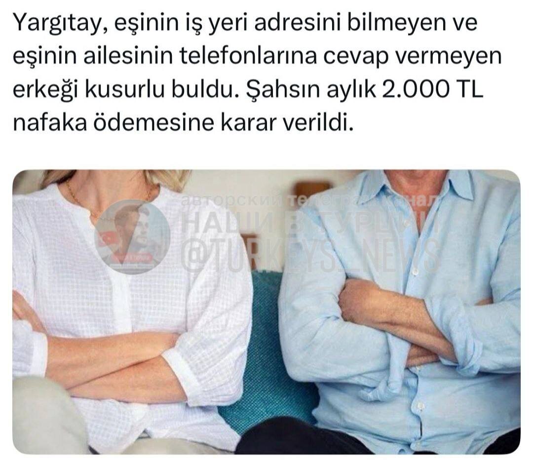🇹🇷 В ТУРЦИИ МУЖЧИНУ ОБЯЗАЛИ ПЛАТИТЬ АЛИМЕНТЫ ЗА НЕВНИМАНИЕ К ЖЕНЕ Верховный суд Турции признал мужчину виновным в нарушении супружеских обязанностей, так как он не знал рабочего адреса своей жены и игнорировал звонки от её семьи. Суд расценил это как признак безразличия и неуважения, что стало основанием для взыскания с него ежемесячных алиментов в размере 2000 TL. 📌 Подписывайся на TurkeyNews Следим за новостями Турции