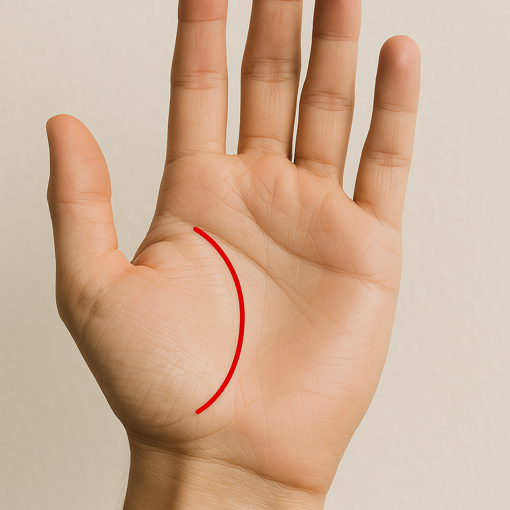 Иногда такая линия может указывать и на духовные поиски, медитативные практики, интерес к эзотерике, особенно если она сопровождается сильной линией интуиции.