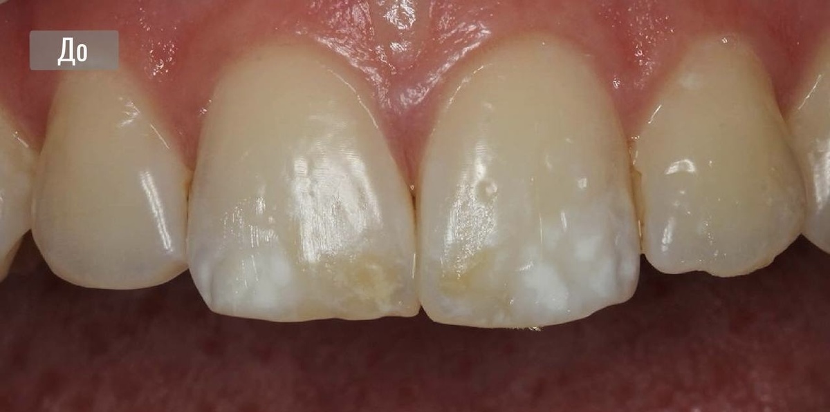В данном клиническом случае, представлена эстетическая проблема в области фронтальных зубов, с которой обратилась пациентка 20 лет. На верхних зубах у пациентки - гипоплазия. Это одно из заболеваний эмали зуба, которое сопровождается изменением цвета, истончением и изменением рельефа тканей. Гипоплазия не является кариозным поражением, но факторов появления таких пятен множество - от внутриутробных (токсикоз, нарушение обменов веществ в организме матери при беременности, прием антибиотиков) до проникновения инфекции из воспалительного очага молочного зуба в зачаток постоянного. Многие из врачей, для этой пациентки, предлагали достаточно радикальные методы избавления от таких пятен. Например, закрыть всё композитными реставрациями или винирами. Но мы все-таки решили применить малоинвазивный подход - сочетанную методику, при которой не требуется препарирование зуба. С помощью микрообразии снимается поверхностный слой эмали на уровне микрон, а далее он восстанавливается инфильтра