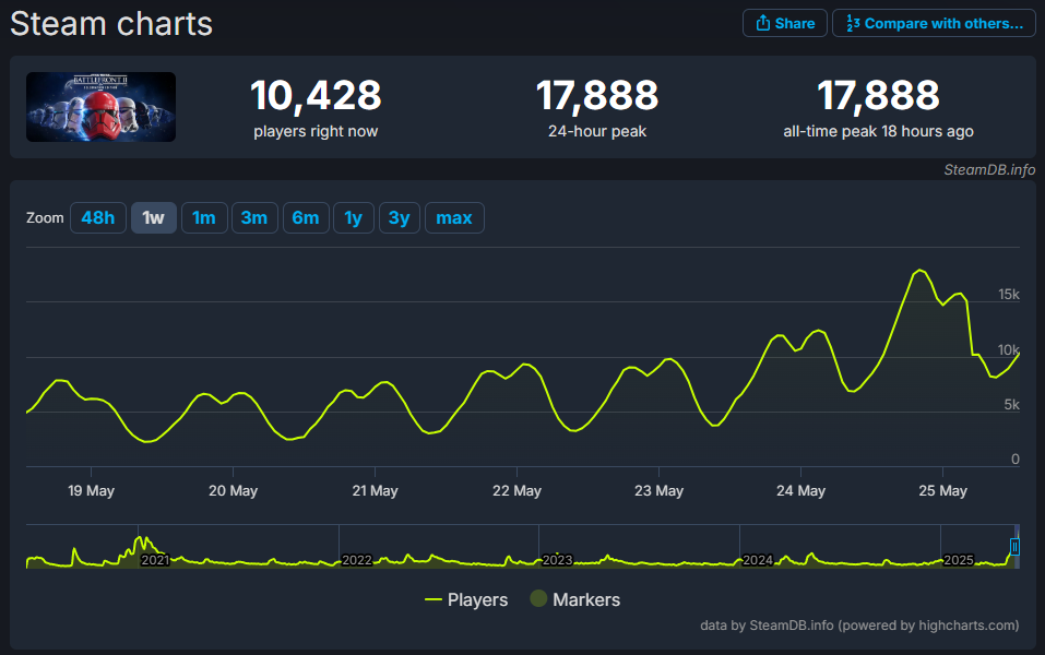 Матс Хельге Хёльм, работавший над обеими частями Star Wars: Battlefront, поделился на Reddit, что он и многие его товарищи хотели бы вернуться в Electronic Arts и поработать над продолжением популярной серии игр. Одновременно с этим, игроки начали массово возвращаться в Star Wars Battlefront II, обновив ее максимальный пик онлайна на платформе Steam. Изначально игра вышла в 2017 году и была доступна только в Origin, но летом 2020 года дебютировала в Steam, а позже и в Epic Games Store. Также сообщается, что общий одновременный онлайн на всех платформах перевалил за 300 тысяч. Такой всплеск популярности удивил многих, что побудило выйти на связь бывшего креативного директора Дэниса Брэннвалла, который поблагодарил игроков за сохранение интереса. Причины подъёма интереса к Battlefront II можно объяснить несколькими факторами. Во-первых, праздник фанатов 4 мая, который известен как день «Звёздных войн». Во-вторых, в Fortnite стартовало тематическое событие по Star Wars, а также возрос инт