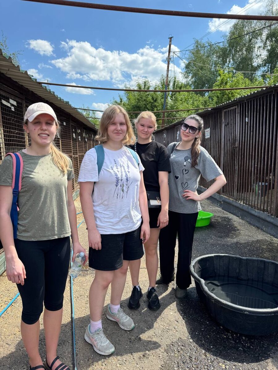 К нам приезжали помощницы из Таможенной академии, нас с ними познакомили волонтеры замечательного проекта VПриюте. Девочки выгуливали собачек, а когда рощу закрыли из-за жары, помощницы занялись вычесыванием хвостиков.