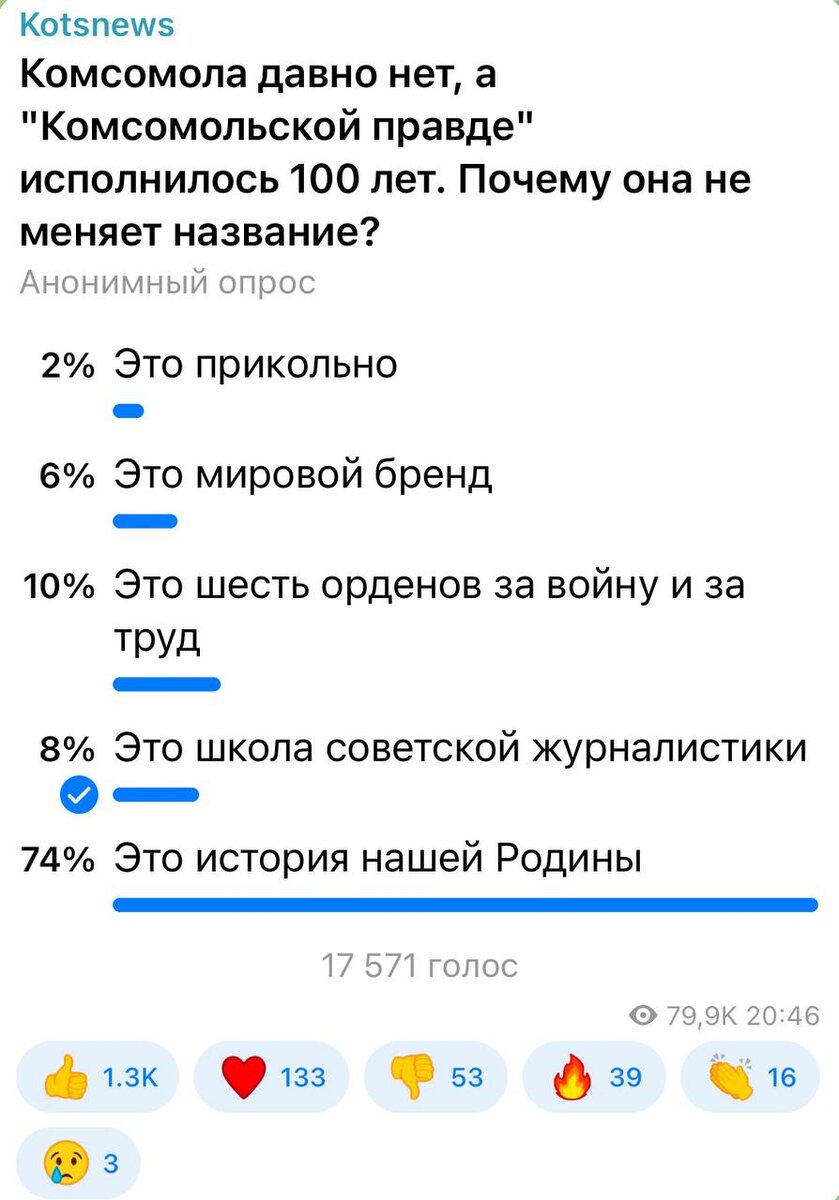 ⚡️⚡️⚡️ 74 процента проголосовавших считают, что это история нашей Родины. Не расстанусь с «Комсомолкой», буду вечно молодым!