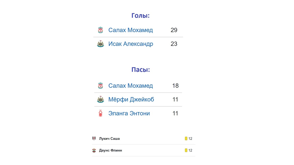 Привет, любители футбола. Это обзор последнего тура чемпионата Англии сезона 2024/2025. Расскажу, как завершились матчи, кто стал лучшим бомбардиром, лучшим ассистентом и кто пробился в еврокубки. Начинаем как всегда с краткого обзора результатов. Борнмут одолел Лестер 2:0. Саутгемптон уступил Арсеналу 1:2. Вулверхэмптон и Брентфорд расписали ничью 1:1. Тоттенхэм крупно проиграл дома Брайтону 1:4 Ипсвич уступил Вест Хэму 1:3. Фулхэм проиграл Манчестеру Сити 0:2. Ливерпуль и Кристал Пэлас поделили очки 1:1. Ноттингем уступил Челси 0:1. Манчестер Юнайтед (О, чудо) победил на домашней арене Астон Вилле 2:0. Ньюкасл минимально проиграл Эвертону 0:1. Бомбардиры. Салах с 29-ю голами стал лучшим бомбардиром сезона. Исак отстал на 6 мячей. Салах – лучший ассистент, 18 передач. Таким образом, Мохамед повторил рекорд по количеству результативных действий за сезон (47). Ранее таких же результатов в 90-х добивались легендарные Энди Коул и Алан Ширер. Саша Лукич из Фулхэма и Даунс Флинн из Саутгем