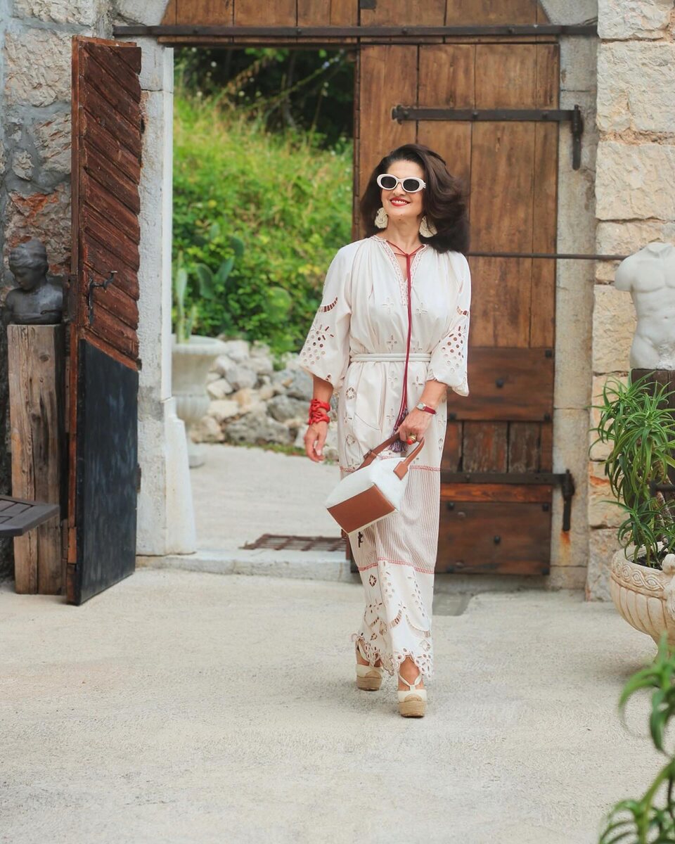 Элегантность – это не просто одежда лаконичного кроя спокойных расцветок, это искусство самовыражения! Наша сегодняшняя героиня умело сочетает простоту и изысканность, создавая гармоничные ансамбли в элегантном стиле. Ниже 10 вдохновляющих идей на текущий сезон. Платье с перфорацией – идеальный выбор на лето. Женщина остановилась на трендовой длине макси. Детали: босоножки, компактная сумка, крупная бижутерия. Искусство сочетания фактур позволяет придать образу глубину. Для этой цели идеально подойдет твидовый жакет и юбка из сияющей атласной ткани. Сумка-тоут перекликается по цвету с солнцезащитными очками. Атласные и шелковые блузки чудесно ладят с трикотажными вещами. В качестве «низа» блогер использовала юбку-карандаш из плотного трикотажа. Прохладным днем можно накинуть на плечи кофту. Дуэт полосатого и ромбовидного принта в одном образе, ничуть не навредил модному имиджу нашей героини. Бежевый монохром говорит о безупречном вкусе своей хозяйки! Такой наряд легко станет частью пов