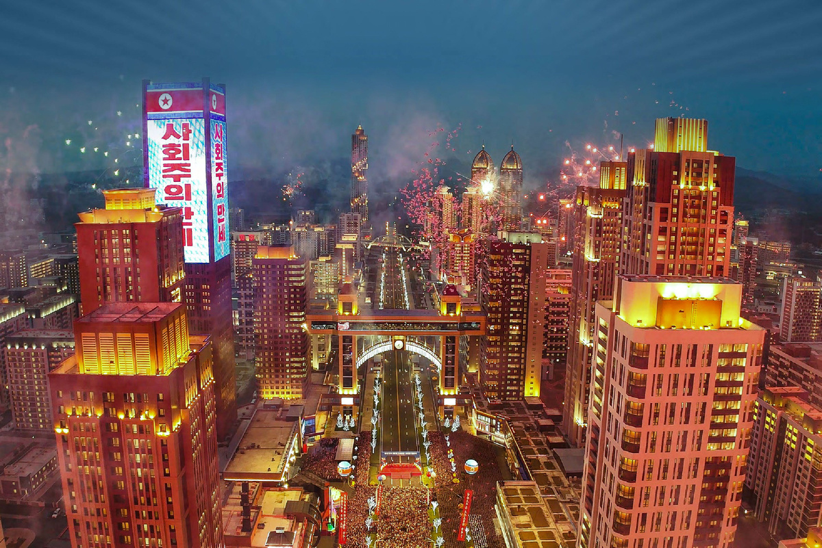 Только в прошлом номере Ким Чен Ын посещал стройку третьей очереди, а в этом он же перерезает ленточку на открытии – 10 тысяч квартир сданы. Да не ленточку, а целое полотнище. Прямо на проспект установили красный подиум, а на него поставили красные кресла. Позади видно интересное архитектурное сооружение – арка-переход между домами. На заднем плане взвиваются вверх и грохочут разноцветные салюты и фейерверки, народ ликует и радуется. Праздник в КНДР – это когда что-то построили, а не от безделья. Тут праздник для пчёл, а не для трутней.