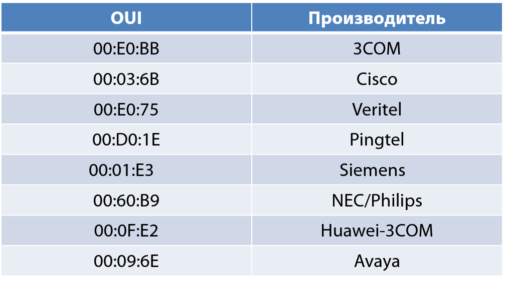 умолчанию предустановлены OUI, перечисленные в таблице. При