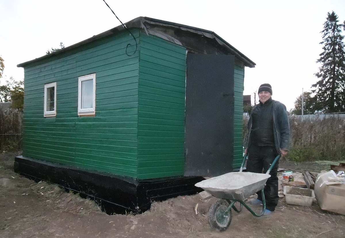 Для тех, кто впервые на канале, поясню. Всем строениям на усадьбе мы присвоили номера в зависимости от времени появления. Разумеется, домик, который стоял там еще до нас, получил номер "1". А охотничьим он называется потому, что охотники его на полозьях из бруса трактором таскали в лес. А когда брус и низ домика подгнили, оказалось, что сдвинуть домик с места не представляется возможным. Передвижной охотничий домик превратился в утлую недвижимость. Так он и остался на пустующем участке, а потом стал нашим первым укрытием от природных катаклизмов. Но, так как быстро привести его в порядок до такой степени, чтобы зимой в нем можно было, хотя бы переодеться и перекусить, не удалось, пришлось поставить на участке строение №2 (или просто "Второй") Но работы по восстановлению "Первого" продолжались. Он был приподнят домкратами и рычагами, под него подлили фундамент, залатали и перекрыли крышу, обшили домик вагонкой и покрасили. С наружи домик уже стал выглядеть прилично. Пришлось купить пару