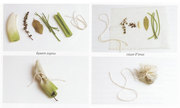 Эти три базовые заготовки очень часто упоминаются в рецептах. Они представляют собой наборы ароматных овощей, зелени и специй, предназначенные для улучшения вкуса блюд, наполнения бульонов, соусов и супов изысканным ароматом... Эти базовые ароматические заготовки добавляют во время процесса приготовления блюд. Букет гарни и саше д’эпис - это травы и свежие овощи, связанные вместе, или ароматные овощи и специи, положенные в марлевый мешочек, чтобы их можно было легко удалить после того, как будет экстрагировано необходимое количество вкуса/аромата. Это обычно делают, когда ингредиенты в блюде еще варятся. Букет гарни составляют, связывая в пучок свежие овощи и зелень. Зелень обкладывают снаружи перьями лука-порея или сельдерея. Если это порей, то его надо очень тщательно промыть. Обрезая нить, оставьте достаточно длинный конец, чтобы привязать к рукоятке кастрюли. Так вам будет легко вынуть букет, когда для этого придет время. Саше д’эпис содержит такие ингредиенты, как перец-горошек и